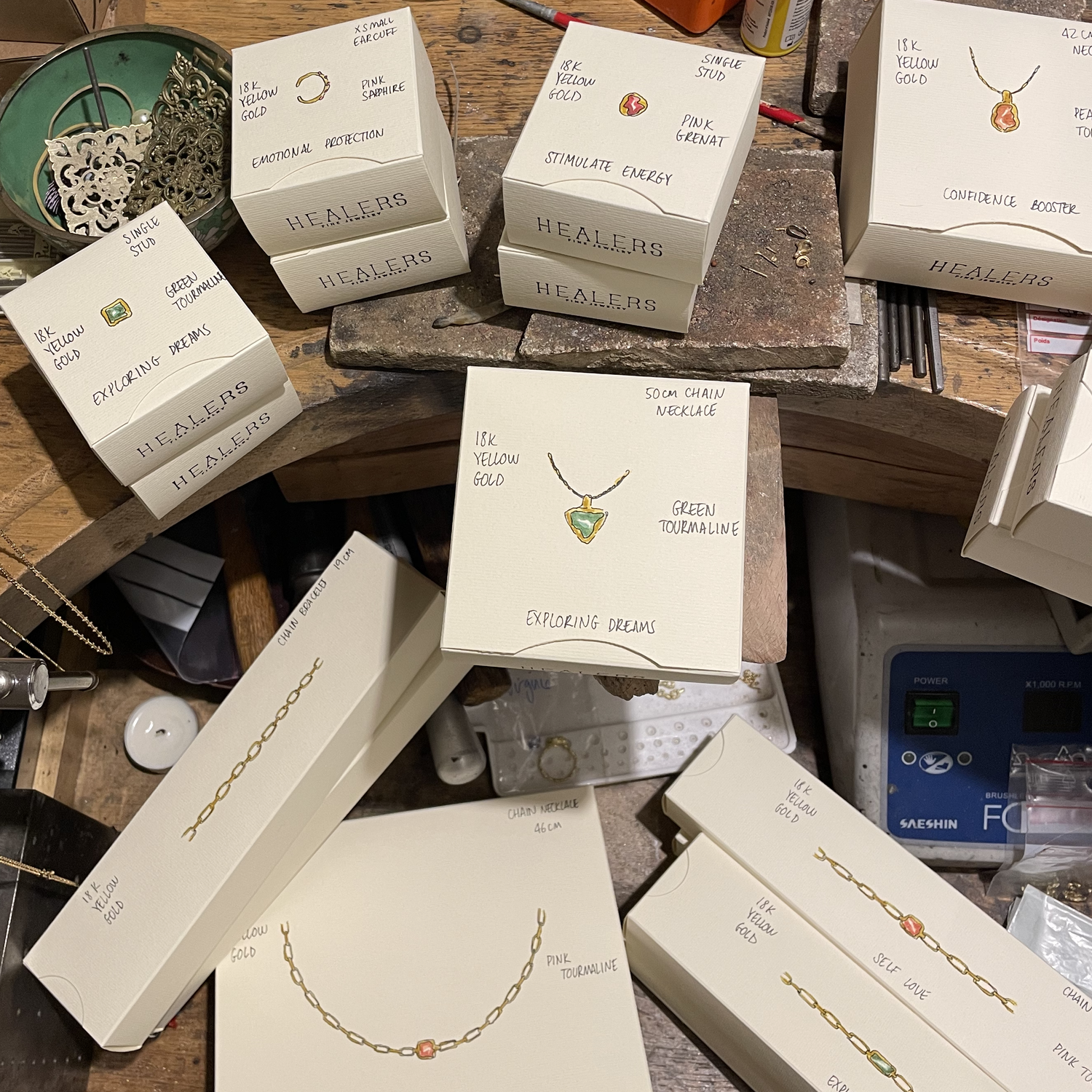 Your piece of jewelry comes in a Black Velvet box protected by a hand sketched paper box.